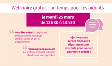 Informez-vous sur les dispositifs départementaux existants pour vous et pour votre proche et posez vos questions, le tout sans avoir à vous déplacer mardi 25 mars, de 12h30 à 13h30.